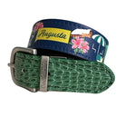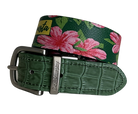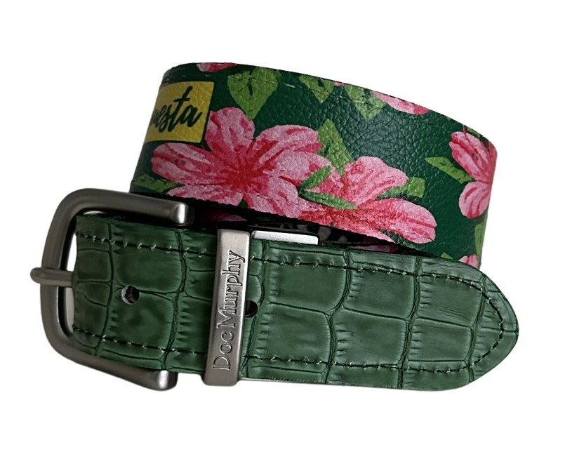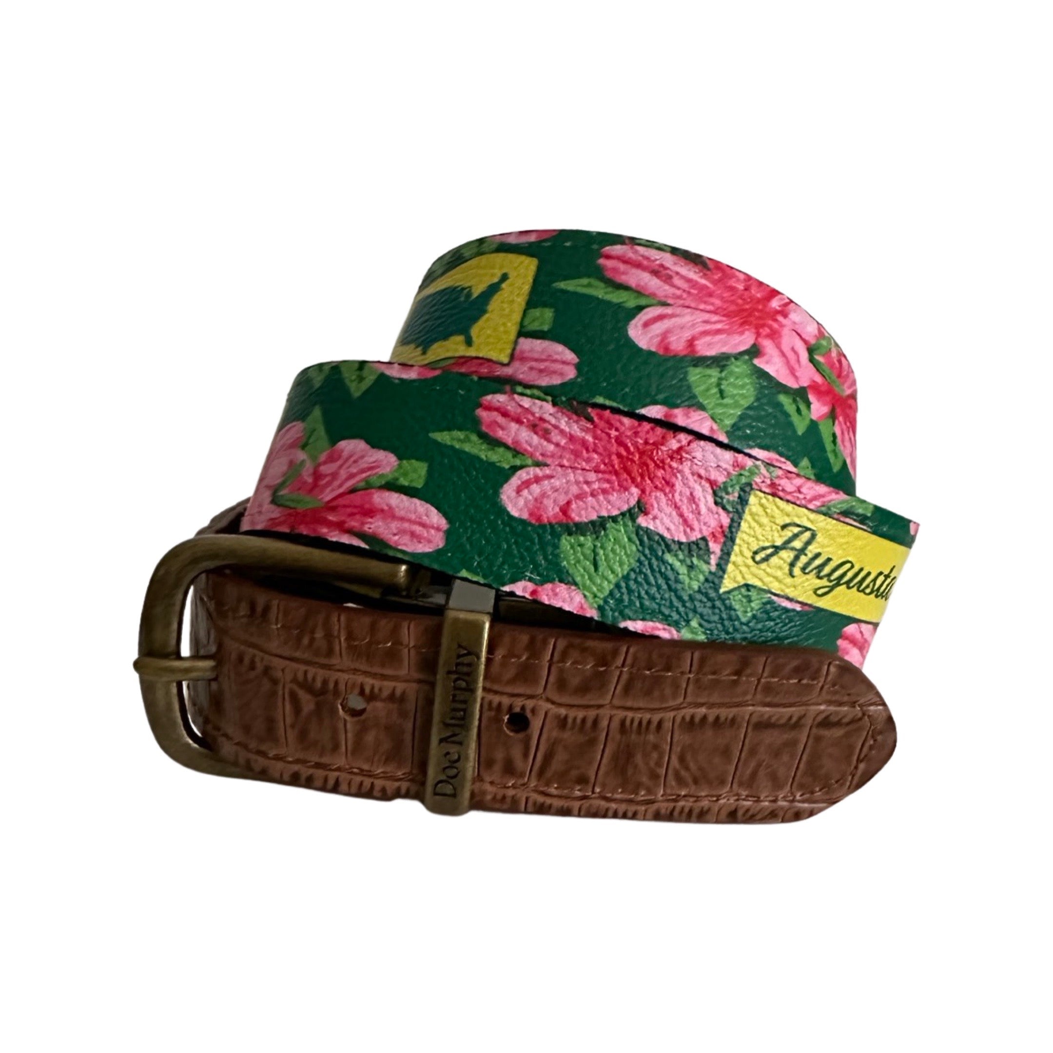 Doc's Famous Azalea Belt reverses to Augusta Wallpaper, available in Cognac or Masters Green Gator tab. Cut to fit, one size fits up to size 44 (42" pant waist size). Please call to special order larger sizes. Ships with one antique brass and one matte nickel buckle. Made in the USA.